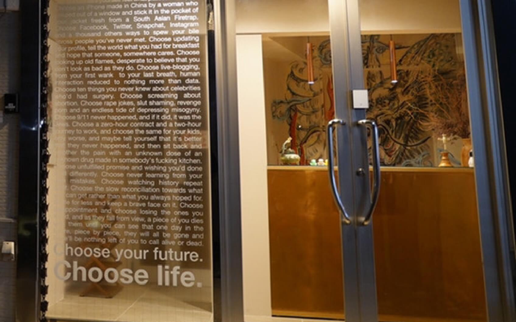 平凡なガラス戸に映画のフレーズを引用したタイポグラフィーのデザインを施すことで、映画好きに刺さるフォトスポットに変え、中の階段を見せたくない左側は目隠し、同時に中の壁画を見せたい右側に視点を誘導する一石三鳥のアイデア。