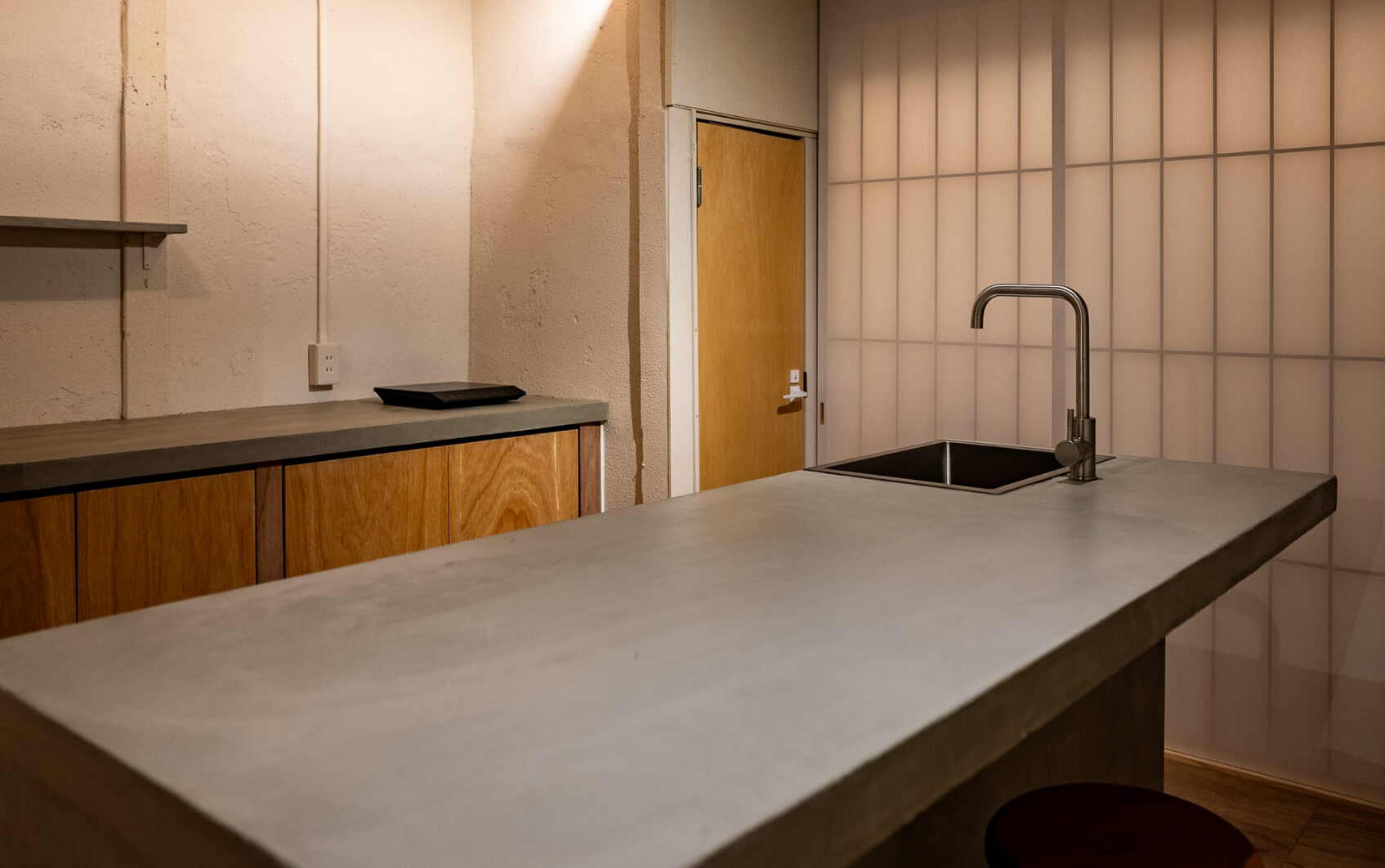 冷蔵庫や洗濯機などは隠す収納で、ミニマムにデザインしたアイランドキッチン。